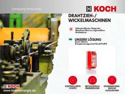 Bei Drahtzieh-/Wickelmaschinen sind Stromausfälle oder Netzschwankungen besonders kritisch: Ein unerwarteter Stromausfall kann schnell zu Drahtabriss, Materialverlust und langer Wiederanlaufzeit führen. Mit unserem aktiven Energiemanagementgerät PxtFX wird dieses Risiko vermieden. Bei Stromunterbrechungen wird die Maschine kontrolliert gestoppt oder die Netzschwankung wird einfach überbrückt, ohne, dass die Maschine dies überhaupt mitbekommt. Ausfallzeiten und Ausschusskosten werden deutlich reduziert und instabile Netze verlieren ihren Schrecken.
