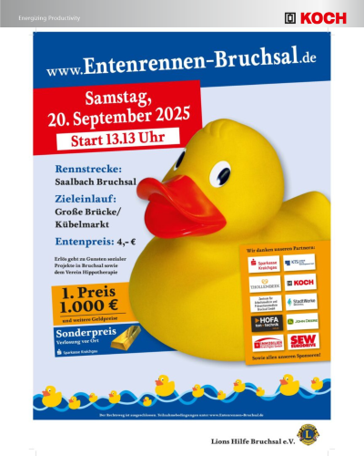 Am 20. September 2025 um 13:13 Uhr ist es wieder soweit: Das beliebte Entenrennen in Bruchsal findet statt! Hunderte von Gummienten gehen auf dem Saalbach an den Start und schwimmen um die Wette. Jede Ente startet durch den Kauf eines Loses – und die schnellste Ente gewinnt. Die ersten zwanzig Plätze werden mit Geldpreisen von bis zu 1.000 € belohnt, zusätzlich wird ein Goldbarren als Sonderpreis verlost.